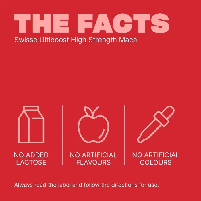 Swisse Ultiboost High Strength Maca হলো প্রিমিয়াম পুরুষদের ভায়টালিটি সাপ্লিমেন্ট, যা এনার্জি, স্ট্যামিনা, লিবিডো ও সামগ্রিক সুস্থতা বজায় রাখতে সহায়তা করে। পেরুর আন্দেস পর্বতমালা থেকে সংগ্রহ করা উচ্চ-সংকেন্দ্রিত ম্যাকা রুট এক্সট্র্যাক্ট শতাব্দীর পর শতাব্দী ধরে পুরুষদের শক্তি ও যৌনস্বাস্থ্য বৃদ্ধিতে ব্যবহৃত হয়ে আসছে।