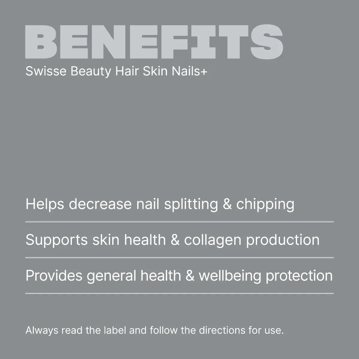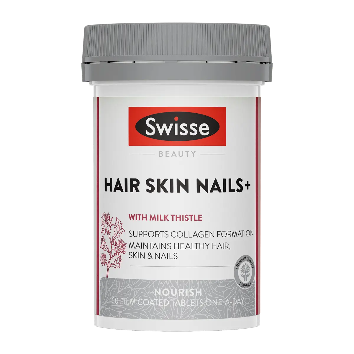 Transform your beauty routine with Australian Swisse Beauty Hair, Skin, and Nails+. One of our best beauty bestsellers, this supplement is packed with nutrients like biotin, silica, zinc, and vitamin C. Biotin maintains strong nails, reducing breakage and splitting, and supports healthy hair. Silica supports connective tissue health, while vitamin C helps maintain collagen production, skin firmness, and promotes healthy, radiant skin. The inclusion of zinc adds extra richness to maintain wound healing and skin health. Every tablet of Swisse Beauty Hair Skin Nails+ is a step towards embracing your beauty from within.